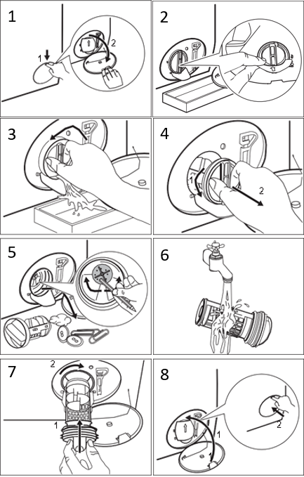 - Puhastage pump ja ebemefilter, kaasa arvatud pumbalaba (kui pumbalaba on nähtav, pöörake seda pliiatsiga ja taaspaigaldage filter).